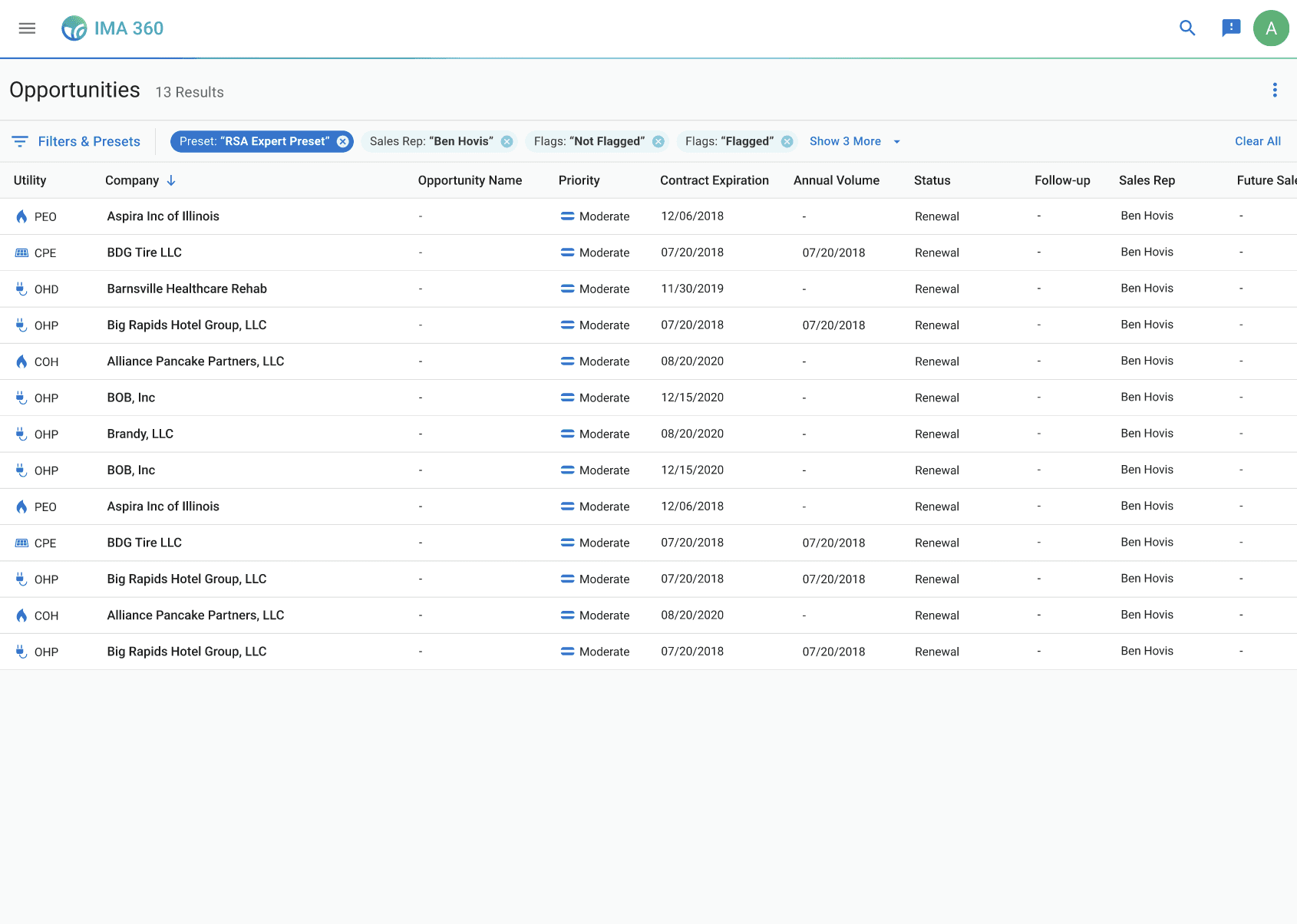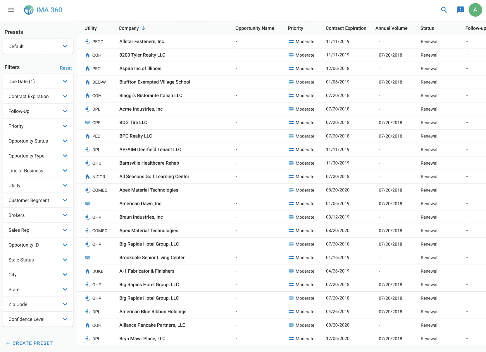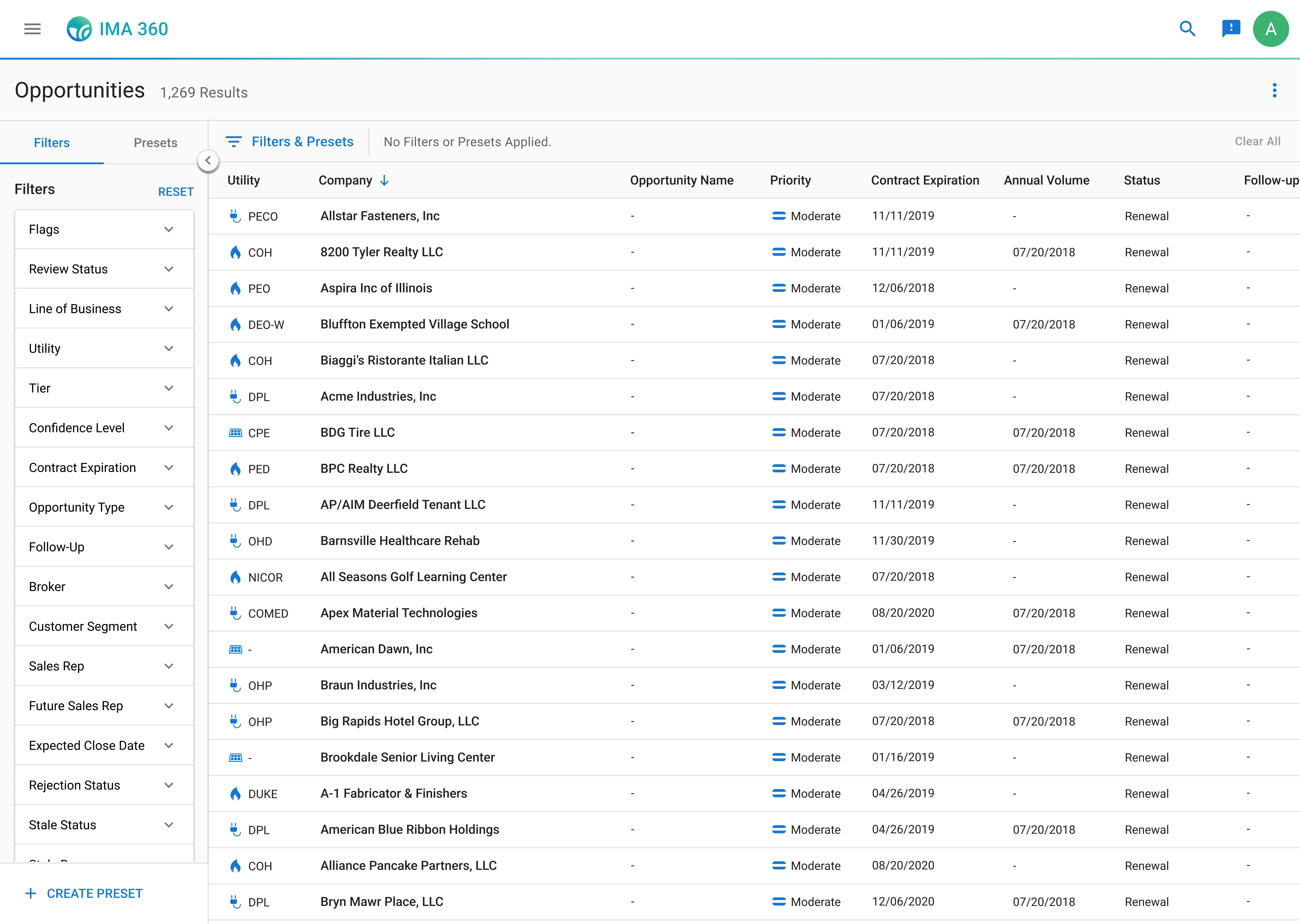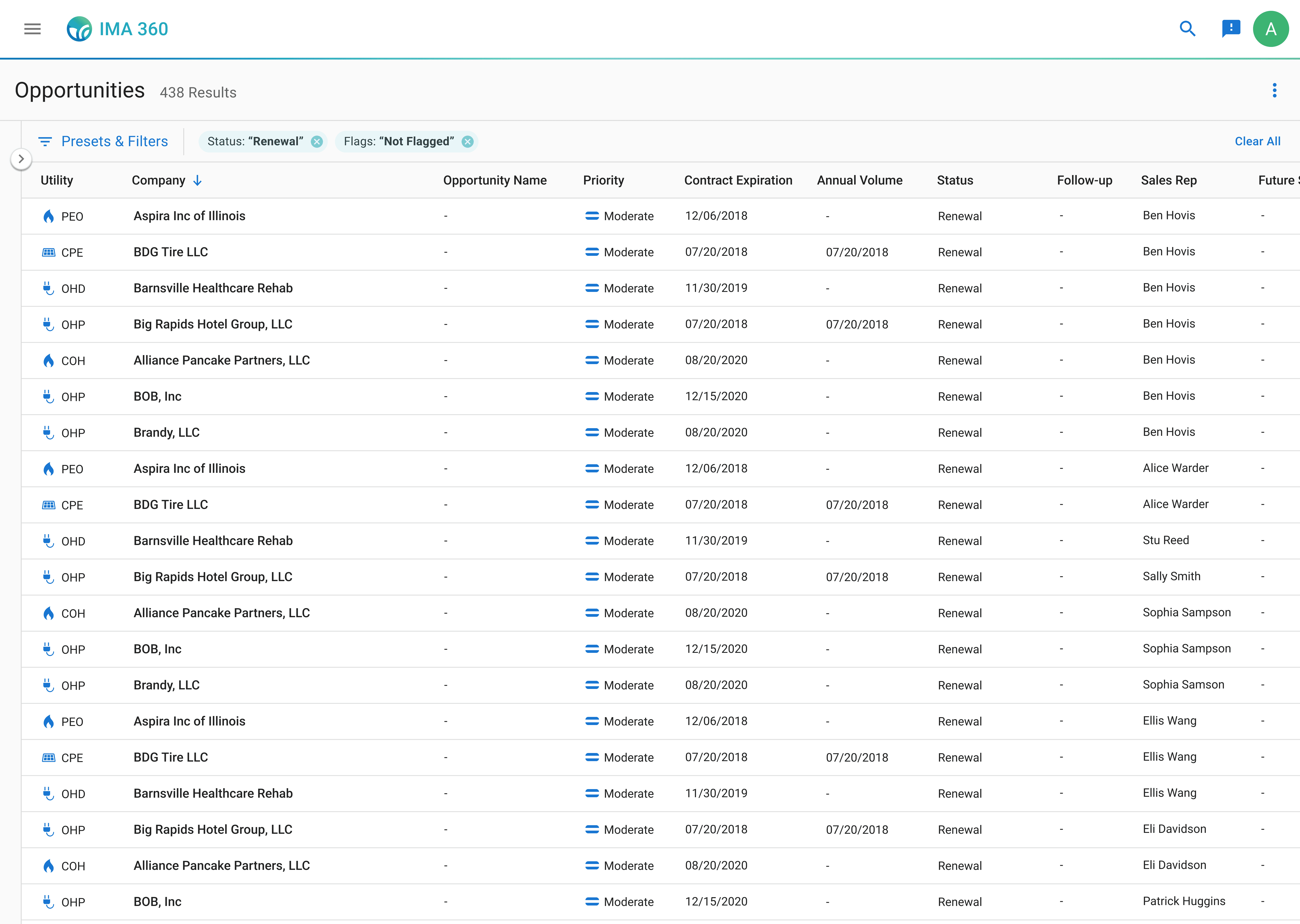 Sales representatives can sort through thousands of company opportunities within the app. Each opportunity includes key attributes, such as utility provider, contract expiration, and status, which can be filtered so sales representatives can quickly narrow results into a more actionable list of leads.