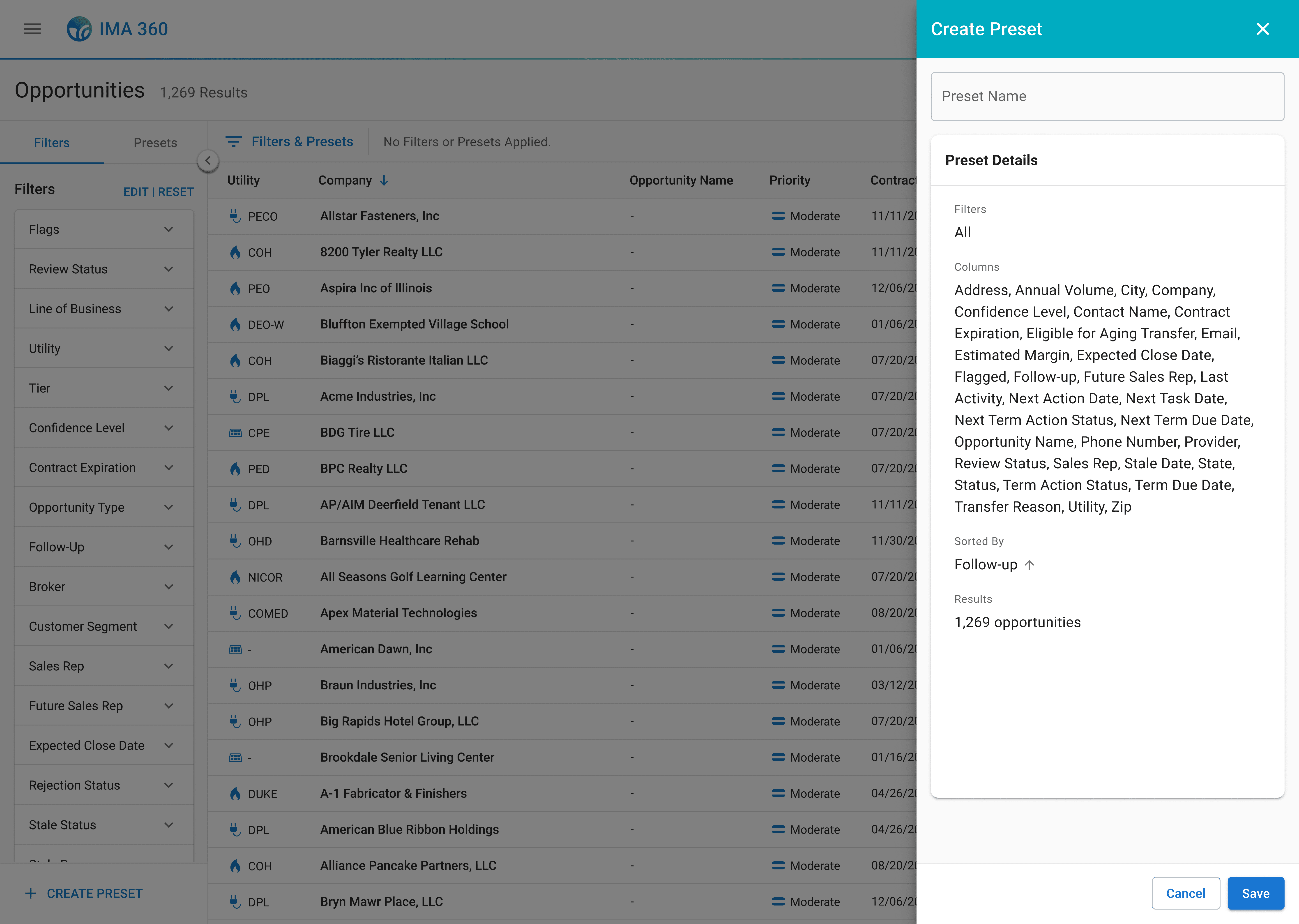 The redesigned filtering feature within IMA 360 streamlines how sales representatives filter, organize, and prioritize leads. With a collapsible filter and presets drawer, an applied filters bar, and customizable filter options, sales representatives can now quickly identify high-value opportunities without getting confused or overwhelmed. They can tailor the filters to meet their own workflow needs, creating more efficient work and driving sales.