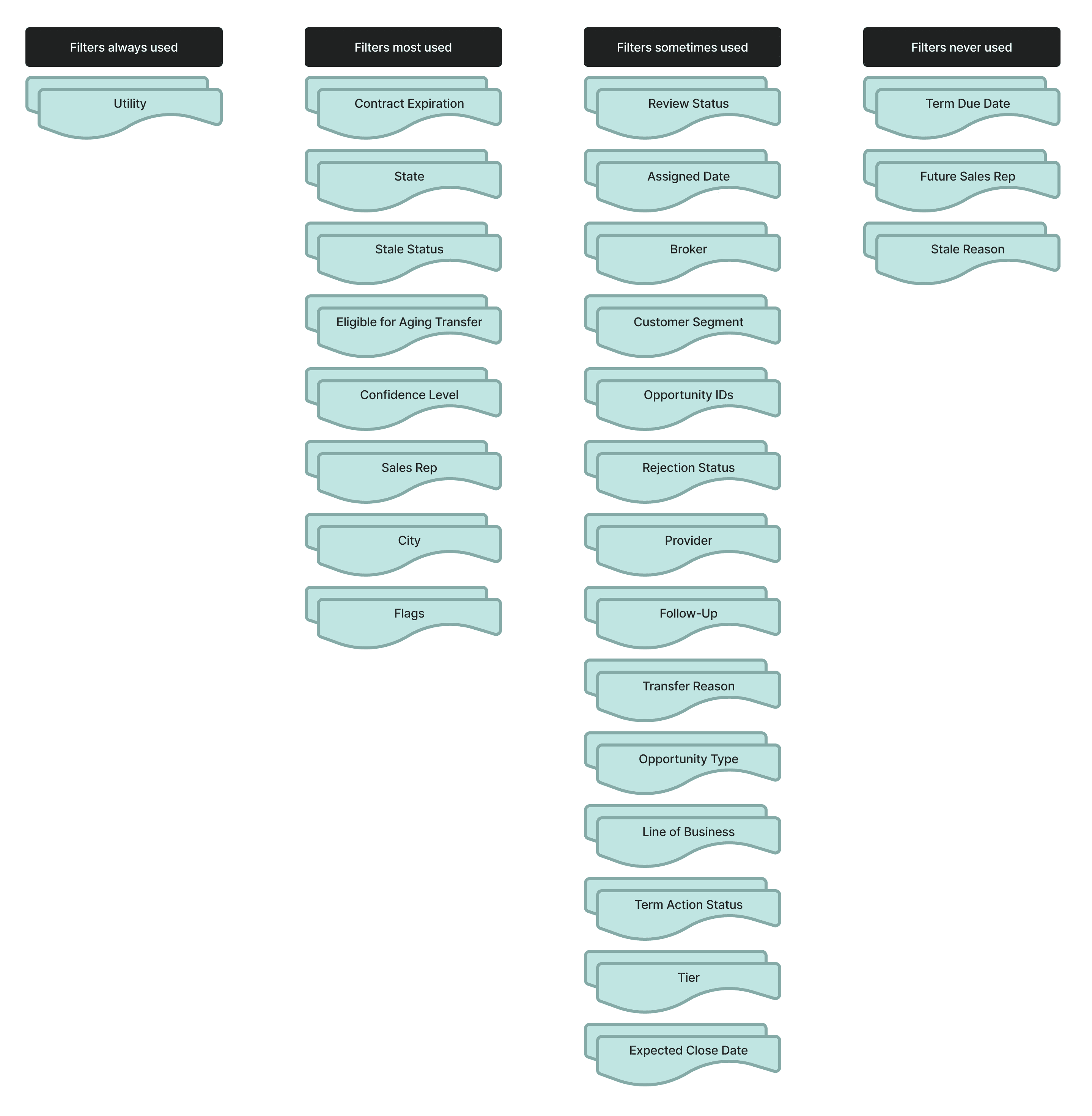 Additionally, each sales representative's process is different. In my interviews, I talked to representatives that worked regionally and others that worked nationally. All of their experience levels varied. Yet everyone was forced to always see the same 26 filters regardless of whether those filters were relevant to their actual workflow.